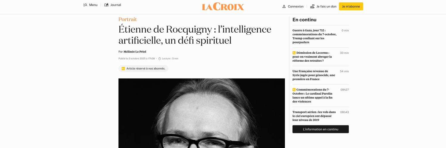 La Croix: "Étienne de Rocquigny: artificial intelligence, a spiritual challenge".