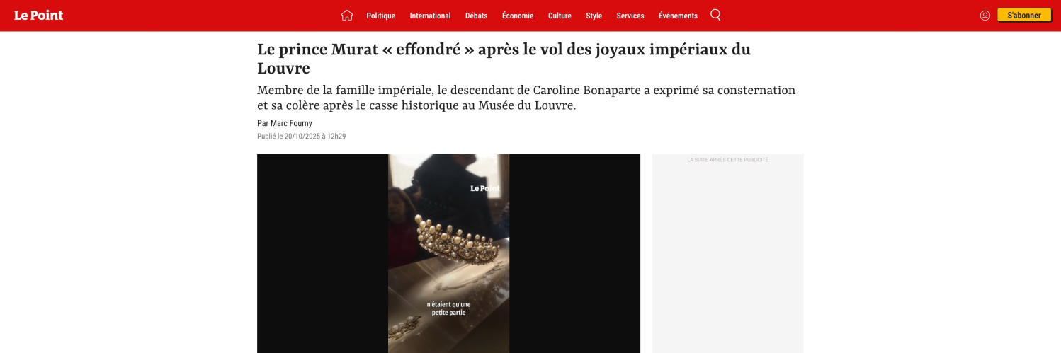 Le Point: "Prince Murat "devastated" by the theft of the imperial jewels from the Louvre".