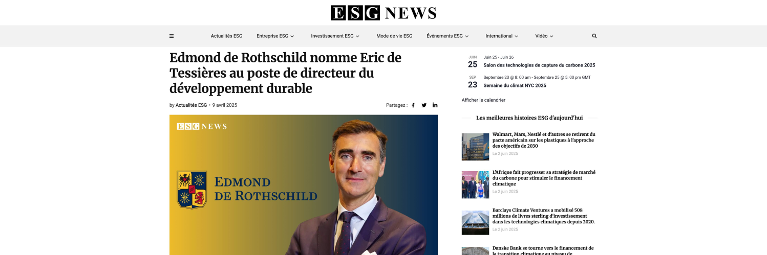 ESG News : "Edmond de Rothschild nomme Eric de Tessières au poste de directeur du développement durable"