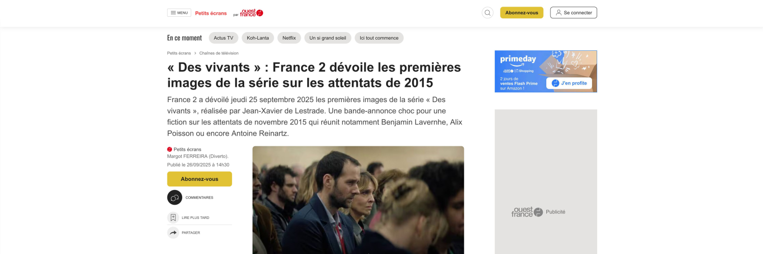 Ouest France : "« Des vivants » : France 2 dévoile les premières images de la série sur les attentats de 2015"